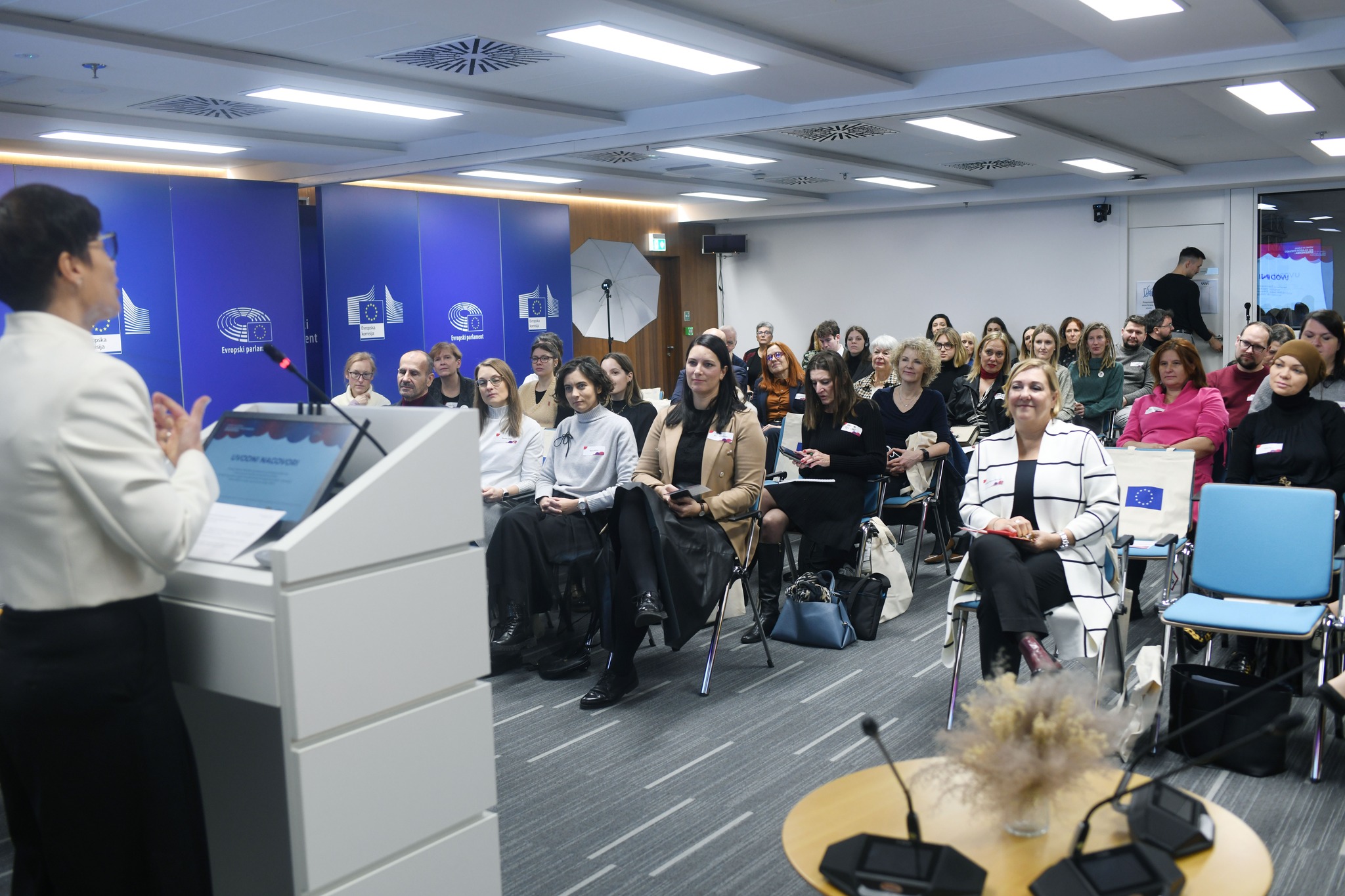 Vodja Predstavništva Evropske komisije v Sloveniji Jerneja Jug Jerše je izpostavila, da je enakost spolov temeljna vrednota EU in pogoj za delujočo demokracijo. Posebej je poudarila, da se ženske še vedno prepogosto same umikajo iz javnega prostora. Osrednji nagovor je imela evropska komisarka Marta Kos, ki je jasno spregovorila o trdovratnih strukturnih neenakostih, t. i. »prekletstvu 20–30 %«, ter o pomenu podatkov, ki razkrijejo razsežnosti problema. Poudarila je tudi pomen zaščite demokracije, svobode medijev in volitev ter opozorila, da avtoritarni sistemi najprej omejujejo pravice žensk.